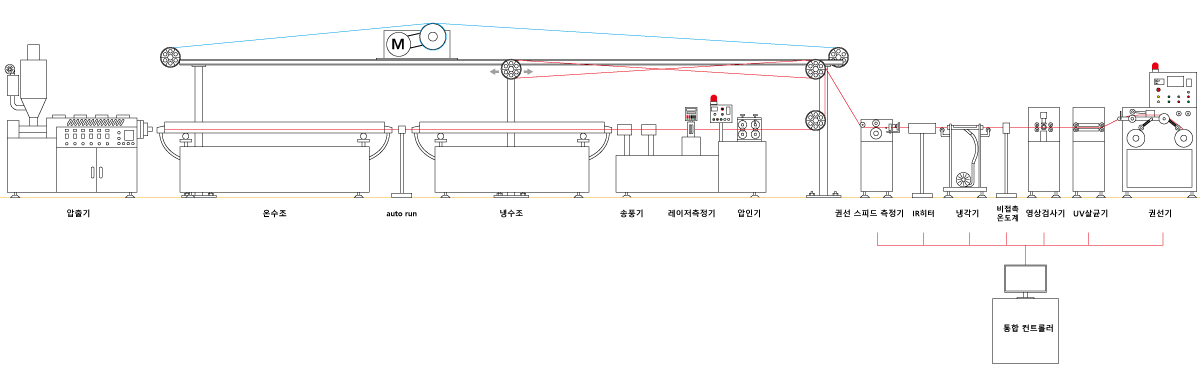 - 원자재 건조 및 배합 - 원재료 압출 작업 - 온/냉수 작업 - 송풍작업 - 레이저측정 작업 - 압인 작업 - 권선 작업